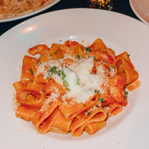 For our main meals, we all had to order some pasta for us to try, and they were all amazing. The table had the Della Casa with shrimp, spicy creamy tomato, and lobster butter; traditional Carbonara; Bosco Mare with linguini, shrimp, peeled tomatoes, shiitake mushrooms, spinach, and garlic butter olive oil; Bacci with shrimp, fresh tomatoes, asparagus, honey chipotle cream.