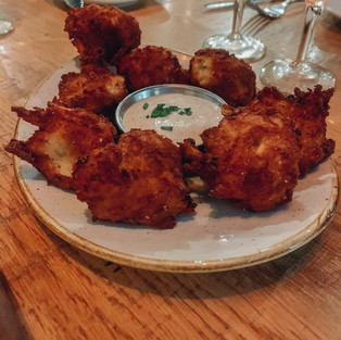 For our meal, we ordered the loaded tater tots and our own plates as well. I got the scallops with the fried green heirloom tomatoes which, once again, was phenomenal. All of the different flavors were put together so well, and I loved it. Of course, we had to order the cookie dough beignets and an Aperol Spritz for dessert to cap off the delicious meal.