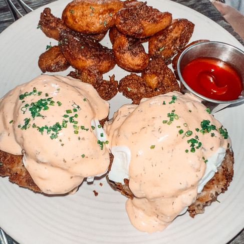 Crab Cake Benedict with crab, English muffin, poached eggs, tomato, hollandaise, and breakfast potatoes